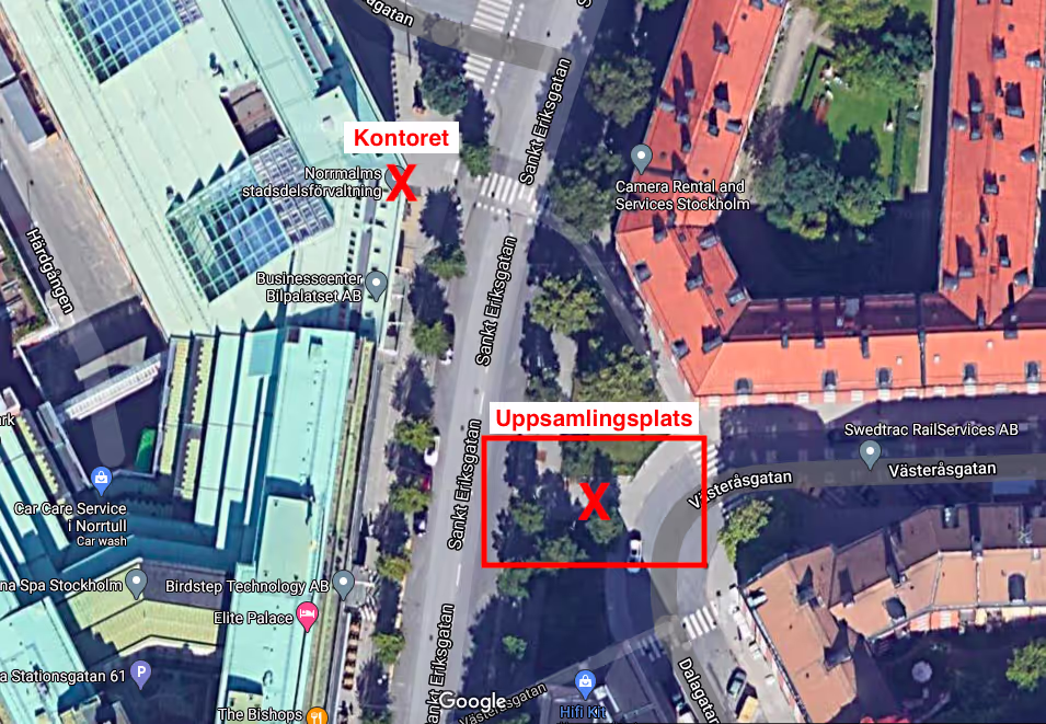 - Parkeringsgarage: Aimo Park, Sankt Eriksgatan 121 (betalning per timme/dygn). Observera att detta är ett dyrare alternativ än gatuparkering.